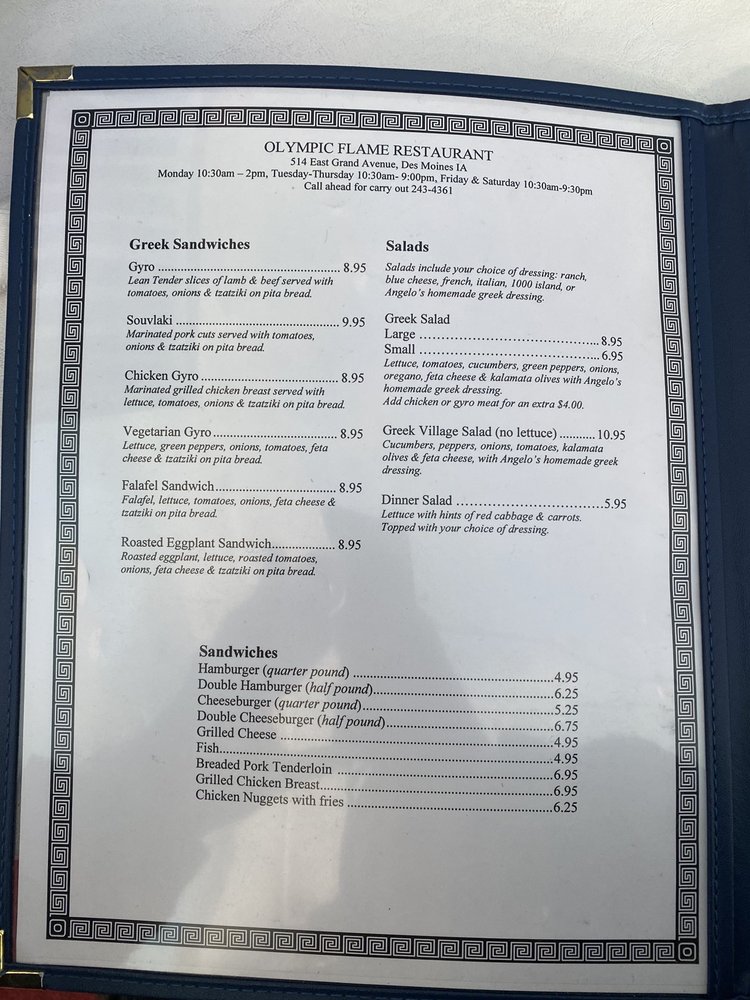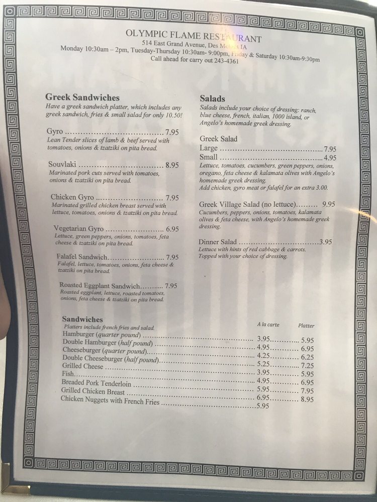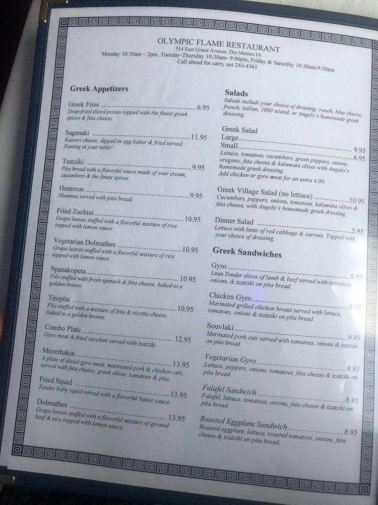 Welcome to Olympic Flame Restaurant, a cherished Greek culinary gem located in the heart of Des Moines. The menu is an evocative journey into Greek flavors, where each dish tells a story. Guests can indulge in the Lamb Chops, perfectly seasoned with aromatic herbs, or savor the delightful Souvlakia, featuring tender cuts of chicken or pork served alongside traditional sides like tiropita and dolma.
